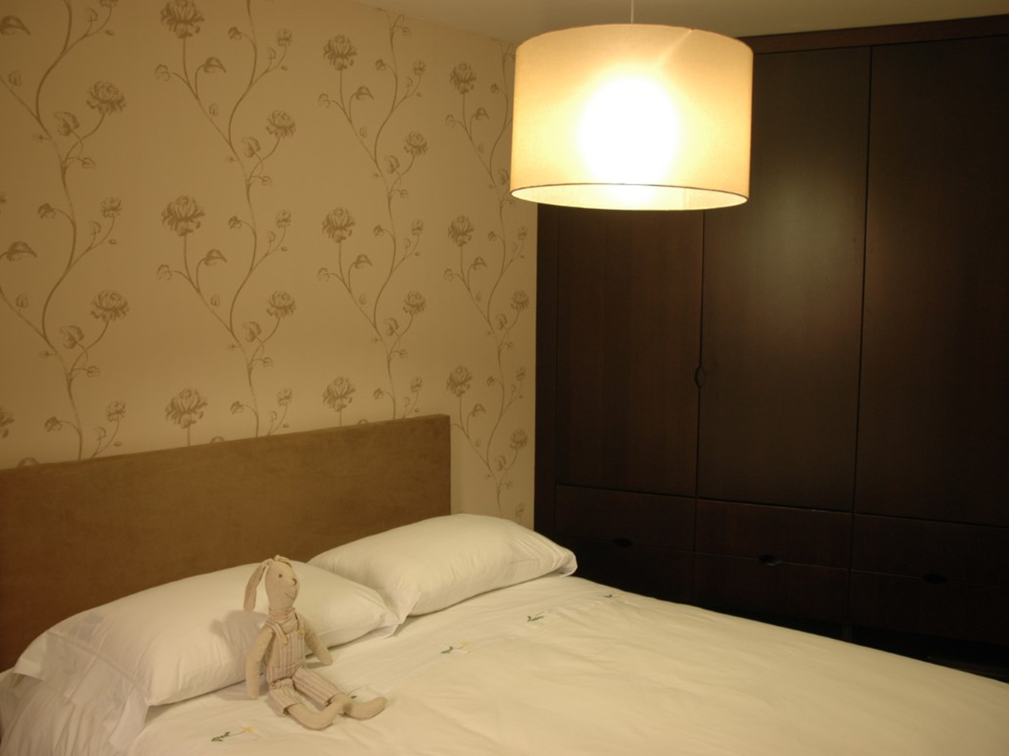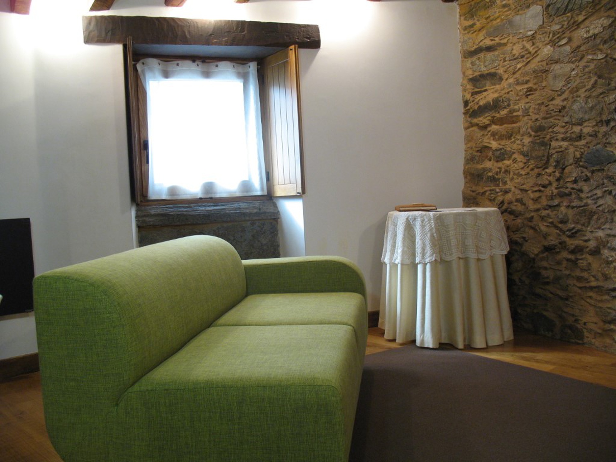 The modern and simple interior decoration provides a harmonious contrast with the building’s rustic features.
