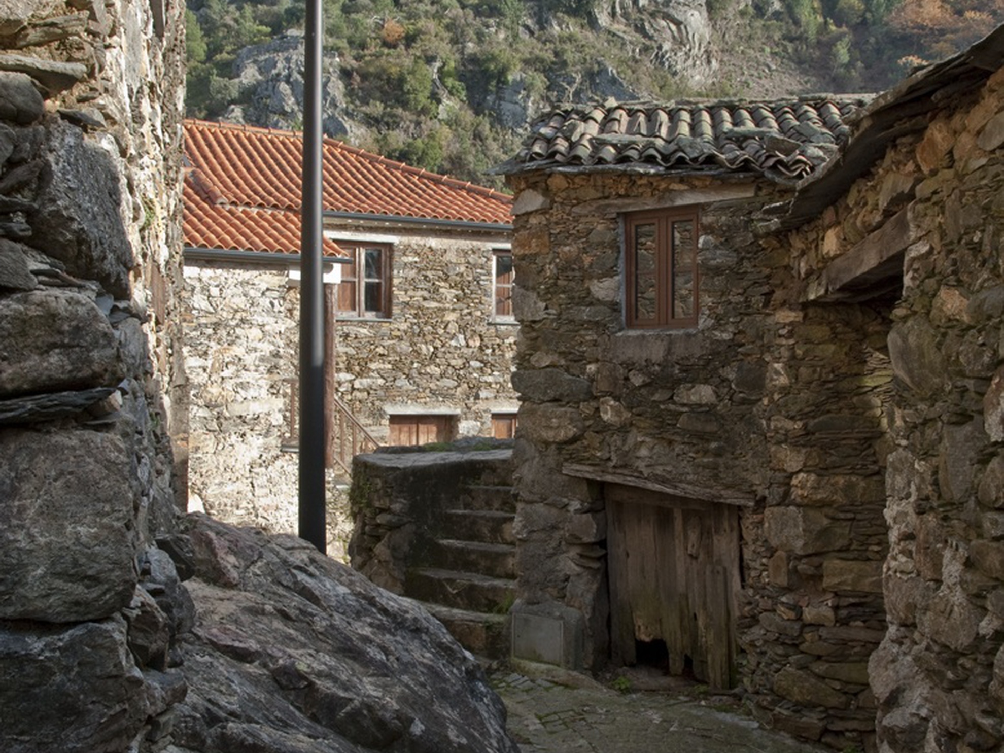 Located at Aldeia do Xisto of Pena, this two-storey house was reconstructed with schist and river pebbles, preserving its identity and characteristics in harmony with typical houses in this mountain region. Among Casa de Neveiro’s most striking features is the fact that it sits on several stones of considering dimensions, and its exceptional harmonisation with nature, with the Penedos de Góis as a backdrop.