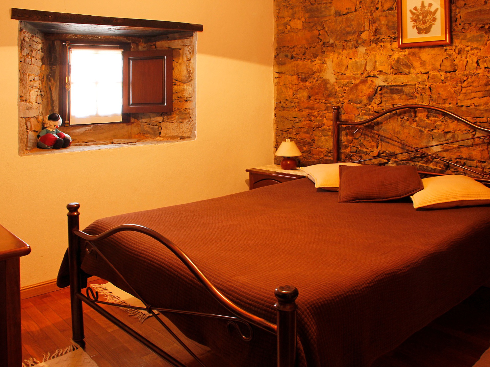 Constituída por dois pisos, a casa dispõe de dois quartos de casal, que mantêm ainda as paredes originais de xisto. É um espaço ideal para dois casais ou um casal com filhos.